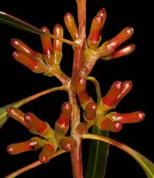 It blooms between June and December producing inflorescences with yellow-white-cream flowers.[2] Each simple, axillary conflorescence is composed of three to seven flowered umbellasters on narrowly flattened or angular peduncles. The cylindrical or conical or rostrate buds have a calyx calyptrate that sheds early. Fruits that form later have a hemispherical shape with a flat disc flat and exserted valves[7] with a width of 0.8 to 1.2 centimetres (0.31 to 0.47 in).[5]