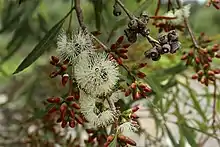 The flowers are borne in groups of between seven and thirteen in leaf axils on a peduncle 3–15 mm (0.1–0.6 in) long, the individual flowers on a pedicel 1–2 mm (0.04–0.08 in) long. Mature buds are oblong to spindle-shaped, 8–11 mm (0.3–0.4 in) long and 2–4 mm (0.08–0.2 in) wide with a conical to horn-shaped operculum. Flowering mainly occurs from June to August and the flowers are white. The fruit that follows is a woody, hemispherical to a shortened sphere 3 to 4 mm (0.12 to 0.16 in) long and 4 to 5 mm (0.16 to 0.20 in) in diameter.[4][5][6]