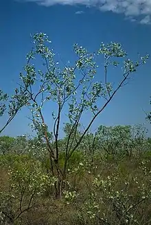 Eucalyptus ceracea also known as the Seppelt Range gum[2] or Seppelt Range yellow-jacket,[3] is a species of small tree or mallee that is endemic to a small area in the north of Western Australia. It has thick, fibrous or flaky bark on the trunk and larger branches, dull, glaucous, egg-shaped leaves arranged in opposite pairs, flower buds in groups of seven or nine, bright orange flowers and urn-shaped fruit. The leaves, buds and fruit are covered with a white wax.