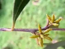 Eucalyptus copulans is a tree, often with several main trunks and with smooth grey or green bark that is shed in ribbons. Young plants have narrow elliptical leaves that are dull greyish green, up to 65 mm (2.6 in) long and 25 mm (0.98 in) wide on a petiole 2–7 mm (0.079–0.276 in) long. Adult leaves are lance-shaped, the same glossy green on both sides, 60–120 mm (2.4–4.7 in) long and 10–18 mm (0.39–0.71 in) wide on a petiole 5–10 mm (0.20–0.39 in) long. The flower buds are arranged in groups of eleven or more in leaf axils on a peduncle 3–8 mm (0.12–0.31 in) long, the individual buds sessile or on a pedicel up to 1 mm (0.039 in) long. Mature buds are cylindrical, up to 8 mm (0.31 in) long and 2.5 mm (0.098 in) wide with a conical operculum about the same length as the floral cup. The fruit is a woody, more or less spherical capsule 4–6 mm (0.16–0.24 in) long and about 5 mm (0.20 in) wide with the valves enclosed below the rim.[3][4]