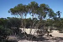 White mallee is found on sandplains on the south western Goldfields-Esperance , Wheatbelt and Great Southern regions of Western Australia growing in mallee shrubland in sandy or clay sand soils with lateritic gravel.[2][5]