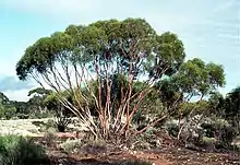 Eucalyptus cylindrocarpa, commonly known as the woodline mallee,[2] is a species of mallee that is endemic to Western Australia. It has mostly smooth bark, sometimes with loose fibrous or flaky bark near the base of the trunk, linear to lance-shaped or curved adult leaves, flower buds in groups of seven, nine or eleven and cylindrical to barrel-shaped fruit.