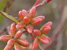 Eucalyptus dissimulata, commonly known as the red-capped mallee,[2] is a species of mallee that is endemic to Western Australia. It has smooth greyish bark that is shed in strips, glossy green, narrow elliptic to narrow lance-shaped adult leaves, flower buds in groups of between seven and eleven, creamy white flowers and short cylindrical to stubby barrel-shaped fruit.