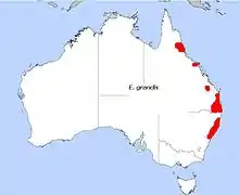 E. grandis is found on coastal areas and sub-coastal ranges from the vicinity of Newcastle in New South Wales northwards to Bundaberg in central Queensland with disjunct populations further north near Mackay, Townsville and Daintree in northern Queensland, mainly on flat land and lower slopes. The soils are deep fertile alluvial loams. The annual rainfall varies from 1100 to 3500 mm.[2] It is the dominant tree of wet forest and rain forest margins,[3] either growing in pure stands or mixed with trees such as blackbutt (E. pilularis), tallowwood (E. microcorys), red mahogany (E. resinifera), Sydney blue gum (E. saligna), pink bloodwood (Corymbia intermedia), turpentine (Syncarpia glomulifera), brush box (Lophostemon confertus) and forest oak (Allocasuarina torulosa).[2] E. grandis has been established in plantations in northern Uruguay and is sold under the trade name "Red Grandis".