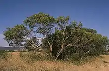 E. incrassata is used as a shade tree, mass planting will offer good screening, good for erosion control or as a windbreak.[6] It is suitable mediterranean and bush style gardens[13] and responds well to coppicing.[6] It is tolerant of both drought and light frost. Able to grow in ordinary soil or enriched soil that is either acidic to alkaline and prefers a position in the full sun.[13] Seeds will germinate in 2 to 6 weeks and it can be grown from cuttings. The tree is susceptible to powdery mildew in the wetter months of winter, it can also be affected by myrtle rust and by dieback.[14]