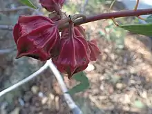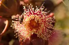 The mallee typically grows to a height of 1.5 to 8 metres (5 to 26 ft) that has rough fibrous bark on the trunk with smooth bark above. It produces white-cream to red-pink flowers between April and October.[1] The flower buds and fruits are large and ribbed or “winged” and are found in pendulous groups of three.[2] It has variable form ranging from a small compact shrub-like habit to a taller more irregular habit. The flowers are highly decorative usually with pink-red buds that open to cream-yellow flowers that are around 3 centimetres (1.2 in) across.[3] The dull, grey-green, thick and concolorous adult leaves have a disjunct arrangement. The leaf blade has a narrow lanceolate to broad lanceolate and is basally tapered. The buds are globose and rostrate, with a calyx calyptrate that sheds early. The fruits are hemispherical with a raised disc and exserted valves.[4][5]
