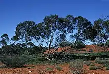 Mann Range mallee grows on plains and dunes in open shrubland and has a wide distribution in the central ranges of Australia, including in South Australia, the Northern Territory and Western Australia. There are also disjunct populations in the Great Victoria Desert, near Wiluna and near Shark Bay. Subspecies vespertina is restricted to near-coastal areas between the Murchison River and Shark Bay.[4][3]