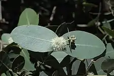 Eucalyptus neglecta is a tree, sometimes a mallee that typically grows to a height of 6–7 m (20–23 ft) and forms a lignotuber. It has smooth grey to brownish bark, but older specimens often have fibrous grey to brown bark on the trunk. The crown of the tree is mostly composed of sessile, juvenile leaves that are arranged in opposite pairs, with some intermediate and adult leaves. Juvenile leaves are greyish green, broadly elliptic to almost round, up to 110 mm (4.3 in) long and 70 mm (2.8 in) wide. Adult leaves are lance-shaped, the same shade of green on both sides, 80–150 mm (3.1–5.9 in) long and 25–35 mm (0.98–1.38 in) wide on a petiole up to 23 mm (0.91 in) long. The flower buds are arranged in leaf axils in groups of between seven and fifteen on an unbranched peduncle up to 5 mm (0.20 in) long, the individual buds sessile. Mature buds are oval, 3–6 mm (0.12–0.24 in) long and 3–5 mm (0.12–0.20 in) wide with a conical to rounded operculum. Flowering occurs between November and February and the flowers are white. The fruit is a woody, cup-shaped or conical capsule 3–4 mm (0.12–0.16 in) long and 4–7 mm (0.16–0.28 in) wide with the valves near rim level.[3][4][5]