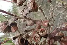 The tree will typically grow to a height of 2 to 7.5 metres (7 to 25 ft) and has white or grey-brown smooth bark and a slender habit. It blooms between July and February producing circular conflorescences with yellow fine flowers.[2] The fruit or capsule are ribbed and barrel-shaped finishing with a point at one end. They are 2.3 to 4 centimetres (0.9 to 1.6 in) in length and 1.8 to 2 centimetres (0.7 to 0.8 in) wide with a thick rim, descending disc and three enclosed valves. The capsules are a red-brown colour that darken with age.[3]