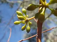 Eucalyptus suberea, commonly known as Mount Lesueur mallee[2] or cork mallee,[3] is a species of mallee or a small tree that is endemic to a small area on the west coast of Western Australia. It has rough bark on some or all of the trunk, smooth white bark above, lance-shaped adult leaves, flower buds in groups of eleven to twenty or more, white flowers and shortened spherical fruit.