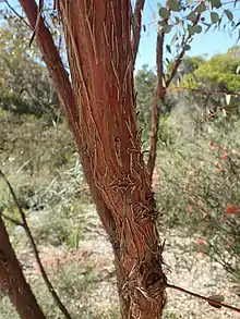 Eucalyptus websteriana, commonly known as Webster's mallee, heart-leaf mallee or dainty mallee,[2] is a species of mallee that is endemic to the Goldfields-Esperance region of Western Australia. It has reddish minnirichi bark on the trunk and branches, egg-shaped to heart-shaped adult leaves, flower buds in groups of seven, pale cream-coloured to yellow flowers and usually hemispherical fruit.