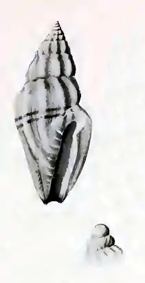 The protoconch consists of two small helicoid whorls. Sculpture:—The first whorl is keeled, and develops small radial ribs. On subsequent whorls the ribs amount to about ten, not continuous from one whorl to the next, bent, and thickened on the shoulder, thence quickly tapering to the suture, continuing in the opposite direction to the base of the body whorl. The whole shell is over-run by microscopic spiral threads, alternately larger and smaller. Aperture :—The mouth is narrow, oblong, protected by a stout varix which ascends the previous whorl, and in which is excavated a shallow semicircular sinus. The outer lip has a very narrow free margin, within which are about eight small inconspicuous teeth. The columella is overlaid by a thick callus sheet with a definite margin, across it extend ten plications. The siphonal canal is a mere notch.[2]