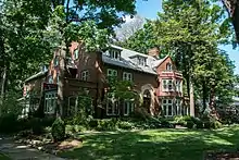 There are 432 structures in the Euclid Golf Allotment Historic District.[51] Fifty-four of these structures are in the Fairmount Boulevard Historic District, and 48 of these 54 are historic. Of the 378 remaining structures, 363 are historic. These include 229 residences, one commercial building, and 133 outbuildings (primarily garages). All of the residences are single-family homes, except for a single duplex and two cottages.[51] Most of the homes in the Euclid Golf Allotment Historic District were designed by leading Cleveland-area architects, including Charles Sumner Schneider, Maxwell Norcross, Mead & Hamilton, Howell & Thomas, and Walker & Weeks.[19]