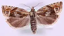 Eucosma aspidiscana, the golden-rod bell, is a species of moth of the family Tortricidae. It is found in China (Anhui, Henan, Shaanxi, Gansu), Mongolia, Korea, Japan, Russia, North Africa and most of Europe.[2][3] The habitat consists of woodlands, downland, waste grounds and cliffs.[4]
