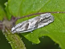 The wingspan is 14–19 mm. This moth has a characteristic wing pattern, with a whitish ground colour, pale brown fasciate markings on the forewings and well-developed black ocelli.[2] Adults have been recorded on wing from July to August in Europe.