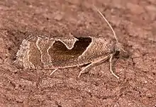 The length of the forewings is 8.1–11 mm for males and 8.2–10.3 mm for females. The forewings are brown with dark brown L-shaped marking with curved edges. There is a large faint tooth in the subterminal area. The hindwings are dirty white, shading to pale brown towards the outer margin. Adults are on wing from July to September.
