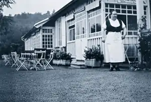 By the end of the 1920s Brazier was exhausted from the effort of building up her restaurant. She left her son, Gaston, in charge and retired temporarily to an old wooden chalet in the foothills of the Massif Central at Col de la Luère, Pollionnay, 17 kilometres (11 miles) from Lyon, and, in the words of the food writer Elizabeth David, "high above its notorious fogs and damp".[34][40] As she started to feel better she began making light lunches for former customers that came to visit her, and gradually built up a second restaurant.[41] The Restaurant Mère Brazier, Col de la Luère became the rural outpost of the Lyon original. Remembering the restaurant after Brazier's death, David described it: