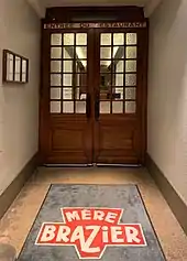 Brazier bought a vacant shop at 12 rue Royale in the first arrondissement of Lyon, on the opposite side of the Rhône from the Fillioux establishment. Her resources were limited: her capital was 12,000 francs (roughly equivalent to 9,200 euros in 2015 terms). With encouragement and advice from her former employer at the Dragon and the help of well disposed suppliers, she built up the business and began to attract regular customers.[30] Her partner, Pierre, whom she never married, worked as a chauffeur during the day and in the evenings "swept the dining rooms, sharpened the knives and prepared the wine carafes".[31] Initially, the restaurant could accommodate only 15 diners, but gradually Brazier increased the capacity, opening a second dining room and, later, a private salon and two small rooms upstairs.[31][32]