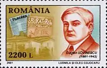 A high school in Bucharest is named after him,[4] and so are streets in Bucharest, Cluj-Napoca, Constanța, Pitești, and Satu Mare. The building in Bucharest where he lived and where the Sburătorul literary society held is meetings from 1938 to 1943 is now called Casa Lovinescu.[5] In 2001, Poșta Română issued a 2,200 lei stamp in his honor.