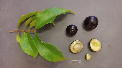 Fruits mature between February and March. The ripe fruit is a round or slightly elongated berry, up to 20 mm wide and 25 mm long. It has a thin purple-black skin and a wet, firm, whitish pulp about 3–5 mm thick, surrounding a loose single (rarely double) seed. It is edible, moderately sweet, with an aroma similar to (but less intense than) that of the jabuticaba.[4]