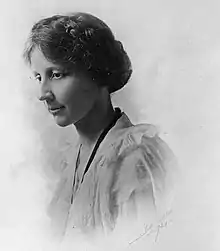 ![[In black and white] A woman seated with cropped or pulled back hair, wearing a white lacy dress, dark banded watch and dark ribbon or necklace. She faces the viewer.](../I/Eunice_Rockwood_Oberly.png.webp)
