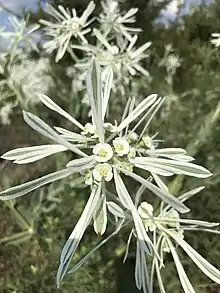 Euphorbia bicolor is a member of the spurge family, Euphorbiaceae. Other members of the family include ornamental plants like poinsettias.[3] The white sap characteristic of this family can cause irritation to the skin or eyes of people who are exposed to it. The honey made from the nectar and pollen of this plant is sometimes referred to as "jalapeño honey" as it can cause irritation to the throat and mouth of those who ingest it.[1]