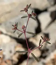 Euphorbia revoluta is a species of euphorb known by the common name threadstem sandmat. It is native to Mexico and the southwestern United States from California to the Rocky Mountains. It is an annual herb producing thin, erect stems with pairs of linear leaves, each leaf up to 2.6 centimeters long. The inflorescence is a cyathium with rounded nectar glands surrounding one female flower and several male flowers. There are sometimes white petal-like appendages as well. The Navajo used this plant as a skin lotion.[1]