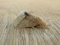 The wingspan is about 50 mm. Adults are hairy and brown, with a broad white band along the terminal area of each wing and a dark brown body.