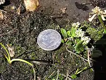 Mining is a common industry in the high mountain peaks occupied by the plant, and mining companies and stakeholders did not agree with federal protection plans for the species and its habitat.[1] Active claims for gold and trace metals are still in place, though mining activity is currently low because of the status of the market. Activities associated with mining, such as ditching, diking, and trail maintenance, alter the hydrology of the landscape, and this is a major threat to the habitat that the plant depends on. There is a specific water balance maintained by the snowmelt from the high ridges which keeps the soil quite wet but not flooded, and changing the path of flowing water could disrupt it.[2] The plant almost always grows within half a meter of actively flowing meltwater.[2] Mining activity could also lower the pH of the normally alkaline soils.[2]