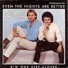 "Even the Nights Are Better" is a 1982 song by the British/Australian soft rock duo Air Supply, released on their seventh studio album Now and Forever (1982) as the album's first single. It first charted in the United States on the Billboard Adult Contemporary chart, where it spent four weeks at No. 1 in July and August. This was Air Supply's third song to reach the summit on this chart.[2] It also reached No. 1 on the Canadian AC chart.[3]