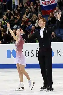 Tarasova/Morozov won silver in Latvia and bronze in Estonia on the JGP series. They qualified for the JGP Final in Fukuoka, Japan, where they finished fourth in both segments and fourth overall. The pair won the silver medal at the 2013 Winter Universiade behind teammates Ksenia Stolbova / Fedor Klimov. At the 2014 Russian Championships, Tarasova/Morozov finished eighth after placing third in the short program and tenth in the free skate. Morozov fell on both of their jumping passes, and Tarasova was hurt when a lift collapsed near the end of their free program but was able to resume and complete the final element, a pair spin.[10] Tarasova was taken to the hospital and found to have no serious injuries.[11] After winning the national junior title a month later, the pair was assigned to the 2014 World Junior Championships in Sofia, Bulgaria. They won the silver medal after placing second in both segments and finishing 5.57 points behind China's Yu Xiaoyu / Jin Yang.