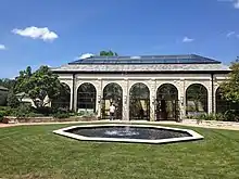 Ewing and Muriel Kauffman Memorial Garden main building and courtyard fountain from the southwest