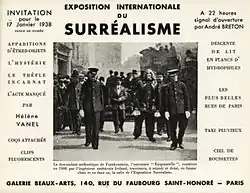 The Exposition Internationale du Surréalisme was an exhibition by surrealist artists that took place from January 17 to February 24, 1938, in the generously equipped Galérie Beaux-Arts, run by Georges Wildenstein, at 140, Rue du Faubourg Saint-Honoré in Paris. It was organised by the French writer André Breton, the surrealists' brain and theorist, and Paul Éluard, the best known poet of the movement. The catalogue listed, along with the above, Marcel Duchamp as generator and arbitrator (to appease the partly fierce conflicts mainly between Breton and Éluard), Salvador Dalí and Max Ernst as technical advisers, Man Ray as head lighting technician and Wolfgang Paalen as responsible for the design of the entrance and main hall with "water and foliage".[1] The exhibition was staged in three sections, showing paintings and objects as well as unusually decorated rooms and mannequins which had been redesigned in various ways. With this holistic presentation of surrealist art work the movement wrote exhibition history.[2]