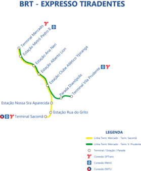 Expresso Tiradentes is the bus rapid transit (BRT) system in São Paulo, Brazil. It is a mid-capacity transportation system that began construction in mid- 1997, under the name of Fura-Fila. During the administration of Mayor Marta Suplicy, in mid- 2001, the name was changed to Paulistão. The current goal of the system is to connect the neighborhood of Sacomã to Parque Dom Pedro II, in order to integrate with other forms of transportation for the residents of the extreme eastern part of the city, mainly Cidade Tiradentes. The stretch between Sacomã and Parque Dom Pedro II and the words Vila Prudente - Parque Dom Pedro II . On April 28, 2009, Mayor Gilberto Kassab and Governor José Serra announced an agreement to amend the project, now to be called Metrô Leve Expresso Tiradentes. The project cost is estimated at R$2.3 billion and is estimated to be completed (between Vila Prudente and Tiradentes ) in 2012. For almost ten years, the BRT project of São Paulo has been postponed, and as a result, its original design has changed so that the current Expresso Tiradentes has lost virtually all the characteristics of a true BRT. An agreement between the Mayor of São Paulo and the Governor declared that the stretch between Vila Prudente and Tiradentes would be a monorail system.[1]