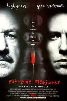 Extreme Measures is a 1996 crime thriller film based on Michael Palmer's 1991 novel of the same name, dealing with the ethics of medical sacrifices. The film was directed by Michael Apted and starred Hugh Grant, Gene Hackman, Sarah Jessica Parker, and David Morse.