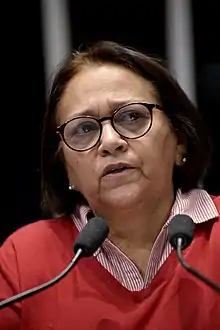Maria de Fátima Bezerra (born 19 May 1955) is a Brazilian politician. She has been serving as Governor of Rio Grande do Norte since January 2019. Previously, she was a deputy for Rio Grande do Norte from 1995 to 2015. She is a member of the Workers' Party.[1]