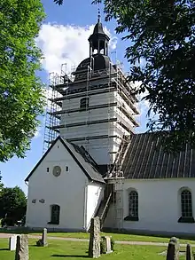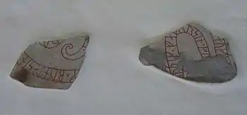 The two fragments named U 20 and U 21 were originally part of the same runestone and were discovered under the plaster of a wall during the renovation of the church at Färentuna.[1] It is likely that other fragments of this runestone may also be part of the church but have their inscriptions facing inwards.[1] They are held to tell of the same family as the Hillersjö stone and the Snottsta and Vreta stones. This runestone is believed to have been raised by Inga in memory of her husband Eric (Eiríkr) and her father Godric (Guðríkr). The runestone has been attributed to the runemaster known as Torbjörn or Þorbjôrn Skald,[1] who signed the Hillersjö stone.