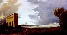 Enormous earthen stands for spectators were built on each side of the field, with a seating capacity estimated at 100,000.[3] The Seine was crossed by a bridge of boats leading to an altar where oaths were to be sworn. The new military school was used to harbour members of the National Assembly and their families. At one end of the field, a huge tent was the king's step, and at the other end, a triumphal arch was built. At the centre of the field was an altar for the mass.