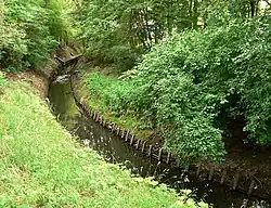 Much of the stream is channeled in the city of Hanover, where the water flows deeper in places and is piped and hidden in the green. A small water treading area has been integrated into the stream here since May 2014.[1]