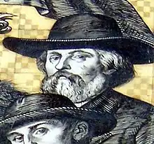 For the upcoming 800th anniversary of the House of Wettin in 1889, another stucco version of a large-scale mural was commissioned. It was painted by the artist Wilhelm Walther between 1871 and 1876. Since the picture rapidly deteriorated, it was replaced with about 23,000 Meissen porcelain tiles between 1904 and 1907.[3] The mural depicts the 35 Saxon margraves, electors, dukes and kings from Conrad, Margrave of Meissen, who ruled in the 12th century, to George of Saxony who was king for only two years in the 20th century. The only ones missing are Heinrich I von Eilenburg (c. 1089) and the last king of Saxony, Frederick Augustus III, who ruled from 1904 to 1918. Also shown are 59 scientists, artisans, craftsmen, children and farmers.[2]