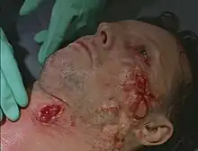 A prisoner with exploding pustules. The pustules were carefully rigged to burst on command by makeup supervisor Toby Lindala.