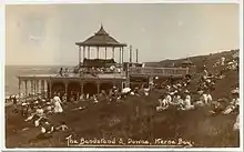 In 1903 to 1904 Palmer planned and oversaw the building of the first phase of the Pavilion in his free time as a "labour of love."[1][2] His plan consisted of a bandstand supported by a small building on a steep slope containing a tea room, rest rooms, a deckchair store and a small, covered auditorium (now the vestibule) to shelter 200 people and a band when it rained.[3][4] There was no natural hollow ready and waiting. Palmer had to dig a hole: