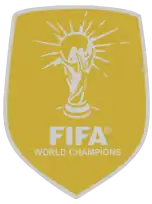 The FIFA Champions Badge is a kit emblem in the shape of a gold and white shield, awarded by FIFA to the reigning world champions of FIFA competitions, both at national team level (e.g. World Cup, Women's World Cup, Futsal World Cup and FIFA Beach Soccer World Cup) and at club team level (e.g. Club World Cup).