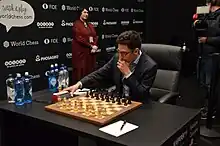 In January, at the 2016 Tata Steel Chess Tournament, Caruana shared second (along with Ding Liren) with a score of 8 points out of 13 (+5-2=6), defeating Michael Adams, Wei Yi, Loek Van Wely, Pavel Eljanov, and Ding Liren, and losing to David Navara and Evgeny Tomashevsky. Had he defeated Tomashevsky, he would have at least tied for 1st place with Magnus Carlsen. Through this tournament, he gained 7 rating points and moved to #3 in the world. By March, as part of the qualification cycle for the World Chess Championship 2016, Caruana participated in the Candidates Tournament 2016, held in Moscow, Russia, from March 10–30 in the Central Telegraph (Центральный телеграф) Building. The lineup of the tournament included Viswanathan Anand, Hikaru Nakamura, Sergey Karjakin, Peter Svidler, Veselin Topalov, Anish Giri, and Levon Aronian. In the final round Caruana had Black against Sergey Karjakin in a winner-takes-all game. A complex position developed in which he made a mistake and was eventually defeated, making Karjakin the official challenger. Caruana eventually finished with a +1 score.[37] On April 25, Caruana became US Chess Champion for the first time, after defeating IM Akshat Chandra in the last round of the US Chess Championship. He finished the tournament with 8.5 points out of 11 games, and went undefeated. The field consisted of world top ten players Hikaru Nakamura and Wesley So; top 100 players Ray Robson, Sam Shankland, Gata Kamsky, and Alexander Onischuk; GMs Alexander Shabalov, Varuzhan Akobian, Jeffery Xiong and Aleksandr Lenderman; and IM Akshat Chandra.[38] In September, he played first board of the US Team at the 42nd Chess Olympiad. The US team won the gold medal, while Caruana won the bronze medal for first board.