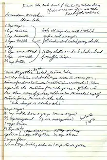 Family cookbooks are books which contain a variety of recipes collected by specific families. Whilst these cookbooks are sometimes later published, the concept is of a commonplace book where useful recipes are retained and passed on to later generations.[1]