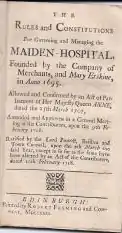 Front page from The Rules and Constitutions for Governing and Managing the Maiden-Hospital, founded by the Company of Merchants, and Mary Erskine, in Anno 1695