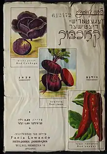 Lewando came to be well known in Vilnius for her vegetarian restaurant Dieto-Jarska Jadłodajnia which was located on Niemiecka street in the Jewish Quarter; it had a number of bohemian and celebrity guests including the artist Marc Chagall and the songwriter Itzik Manger.[1][7][8][3] She also operated a cooking school which was located a few blocks away.[1] She published her Yiddish-language vegetarian cookbook in 1938.[3][9] It contained a number of Jewish cooking recipes adapted for a vegetarian diet, and was exported to England and the United States. She attempted to market the recipes to the H. J. Heinz Company.[3]