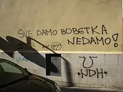 The conflation of modern and obsolete nationalist themes sometimes produces bizarre inconsistencies, as shown at picture on the right: at the time when the ICTY wanted Croatian general Janko Bobetko, the right-wing part of the public was adamant in its demands to prevent that, and some extremist painted graffiti saying so, together with neo-fascist symbols. At the same time, Bobetko was quite clearly not a neo-fascist himself, because his family was killed by the Ustaše,[54] and he fought against them.