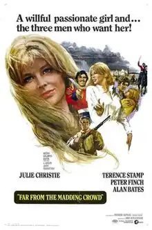 Far from the Madding Crowd is a 1967 British epic period drama film adapted from Thomas Hardy's 1874 book of the same name. The film, starring Julie Christie, Alan Bates, Terence Stamp and Peter Finch, and directed by John Schlesinger, was Schlesinger's fourth film (and his third collaboration with Christie). It marked a stylistic shift away from his earlier works exploring contemporary urban mores. The cinematography was by Nicolas Roeg and the soundtrack was by Richard Rodney Bennett. He also used traditional folk songs in various scenes throughout the film.