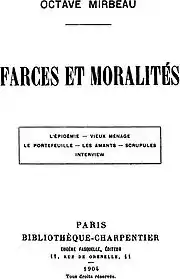Farces et moralités (Farces and morality plays) is a collection of six comedy plays in one act, written by the French novelist and playwright Octave Mirbeau and published by Fasquelle in 1904: Vieux ménages (Old couples), L’Épidémie (The Epidemic, Bloomington, University of Denver Press, 1949), Les Amants (The Lovers), Scrupules (Scruples, New York, Samuel French, 1923), Le Portefeuille (The Purse) and Interview.